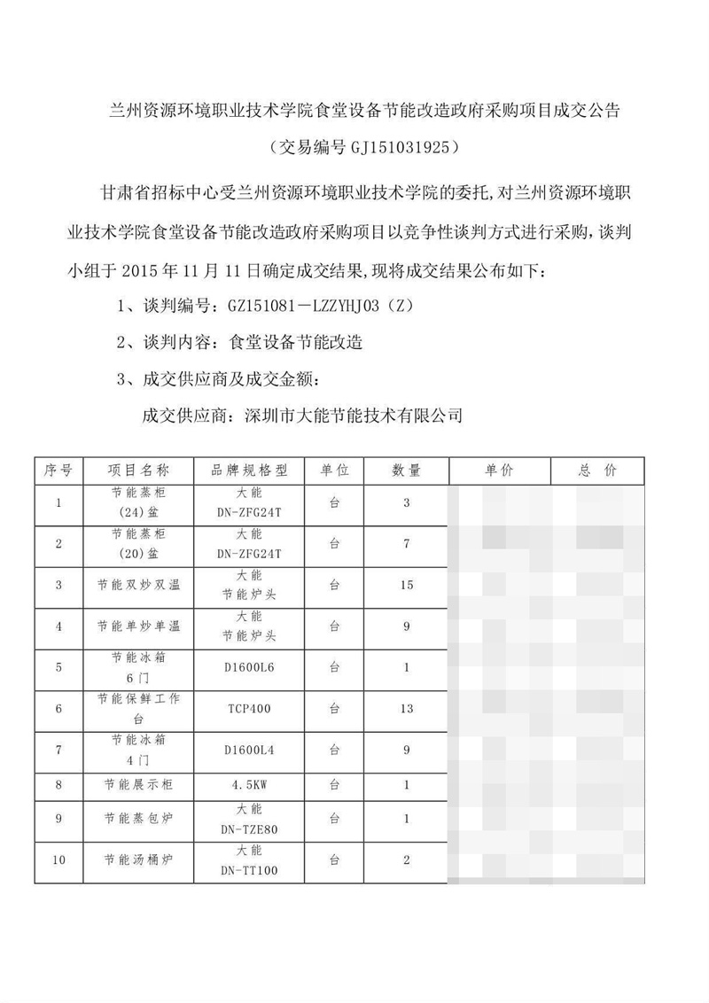 熱烈祝賀深圳市大能節(jié)能技術(shù)有限公司再次中標(biāo)蘭州資源環(huán)境技術(shù)學(xué)院食堂設(shè)備節(jié)能改造政府采購(gòu)項(xiàng)目。